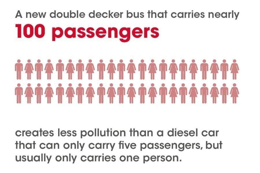 A double decker bus creates less pollution than a diesel car and while a car can carry five passengers, they are often only carrying one!