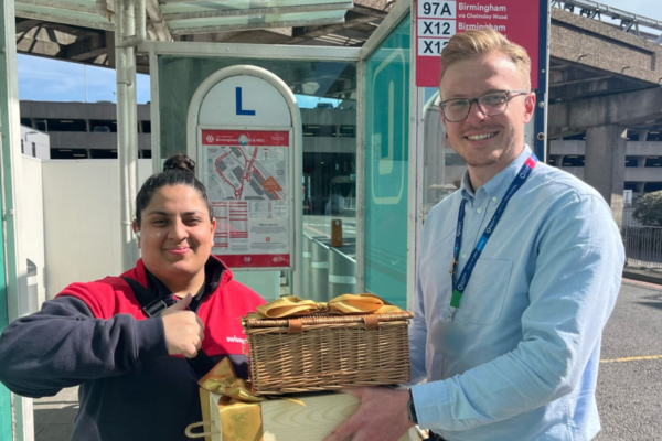 To celebrate the milestone, a surprise gift was presented to 97A customer Lea Tariq by Alex Johnson, Transport Analyst at Birmingham Airport.